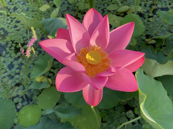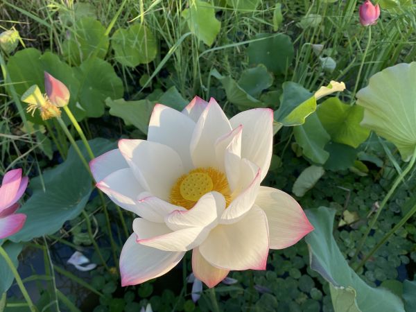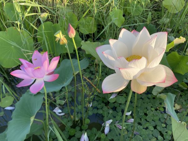 周末清晨六點,和好友相約到南湖公園賞荷花。走進公園沿著木橋靠近湖面,恰逢太陽慢慢升起,在水面折射出七彩光暈,微風吹過平靜的水面,給湖面留下陣陣漣漪。只見荷葉中每朵荷花都是出污泥而不染,淡雅純凈使人陶醉。靜靜欣賞著這亭亭玉立的荷花,看著蜜蜂在荷花上飛來飛去,腦海中不由得想起《愛蓮說》中的:予獨愛蓮之出淤泥而不染,濯清漣而不妖,中通外直,不蔓不枝”這句詩詞。是啊,荷花雖出自淤泥之中,卻纖塵不染,出自于清水之中卻又不妖媚,荷花展現(xiàn)在世人面前的就是一種高貴正直的象征,同時也是清廉的象征。