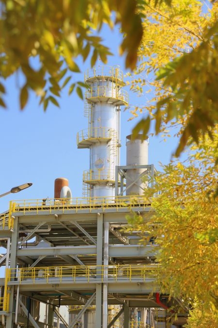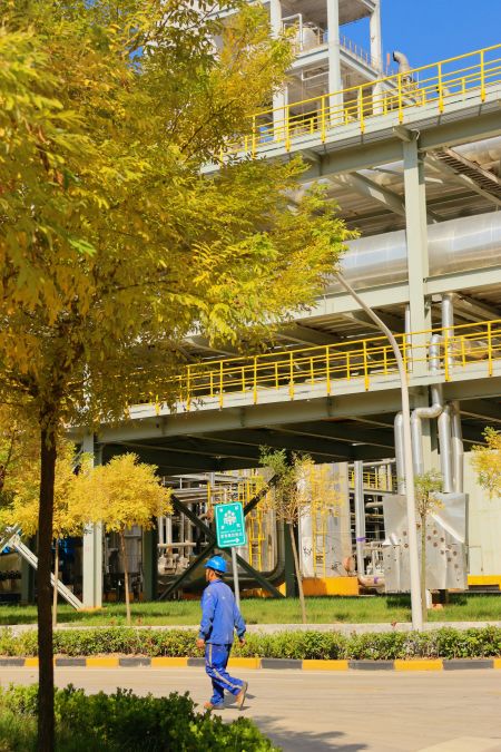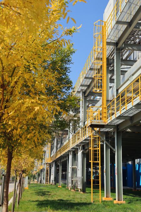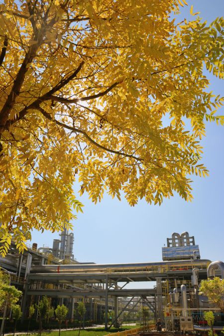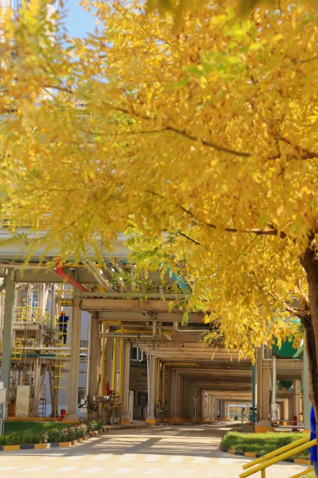 “萬(wàn)美之中秋為最”,秋不止在山村田野間路過,還停留在新民塬工業(yè)園區(qū)的每一處不起眼的角落里。漸漸泛黃的樹葉與銀白色的精餾塔形成鮮明的比照,愈發(fā)凸顯出藏在工業(yè)建筑里獨(dú)特的秋色;陽(yáng)光從金黃的樹隙間透過,散發(fā)著耀眼的光芒;道路兩旁,幾株不知名的野花努力地挽留著詩(shī)情畫意的秋天;工業(yè)的“高冷”與秋天的“詩(shī)情畫意”在這片土地上實(shí)現(xiàn)完美的交融,這便是藏在彬州化工里的秋色。