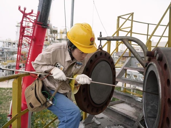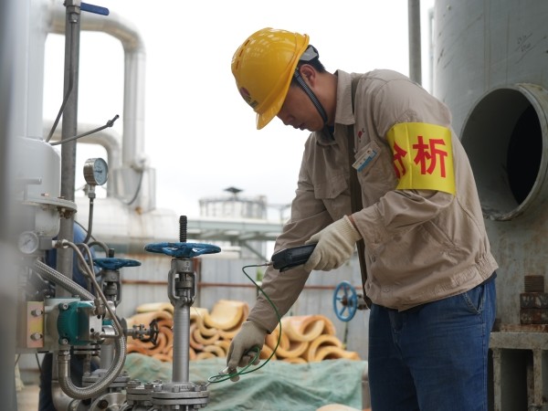 在彬州公司中修現(xiàn)場(chǎng),他們是嚴(yán)謹(jǐn)?shù)摹鞍踩l(wèi)士”。頭戴黃色安全帽,臂佩“分析”袖章,專(zhuān)注檢測(cè)設(shè)備,用儀器探尋隱患。無(wú)論是管道閥門(mén),還是罐體孔洞,每一處都細(xì)致排查。攀爬、蹲守,記錄數(shù)據(jù),他們以專(zhuān)業(yè)與認(rèn)真,守護(hù)生產(chǎn)安全,筑牢化工生產(chǎn)的“安全防線” 。